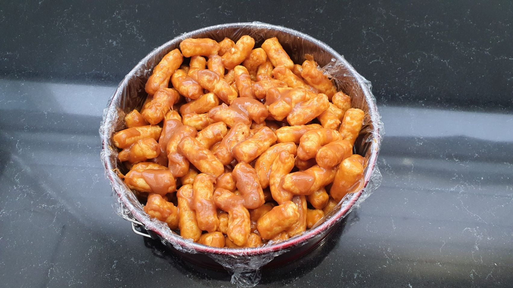 Rozpuścić w garnku krówki i margarynę na małej mocy cały czas mieszając np. drewnianą łyżką