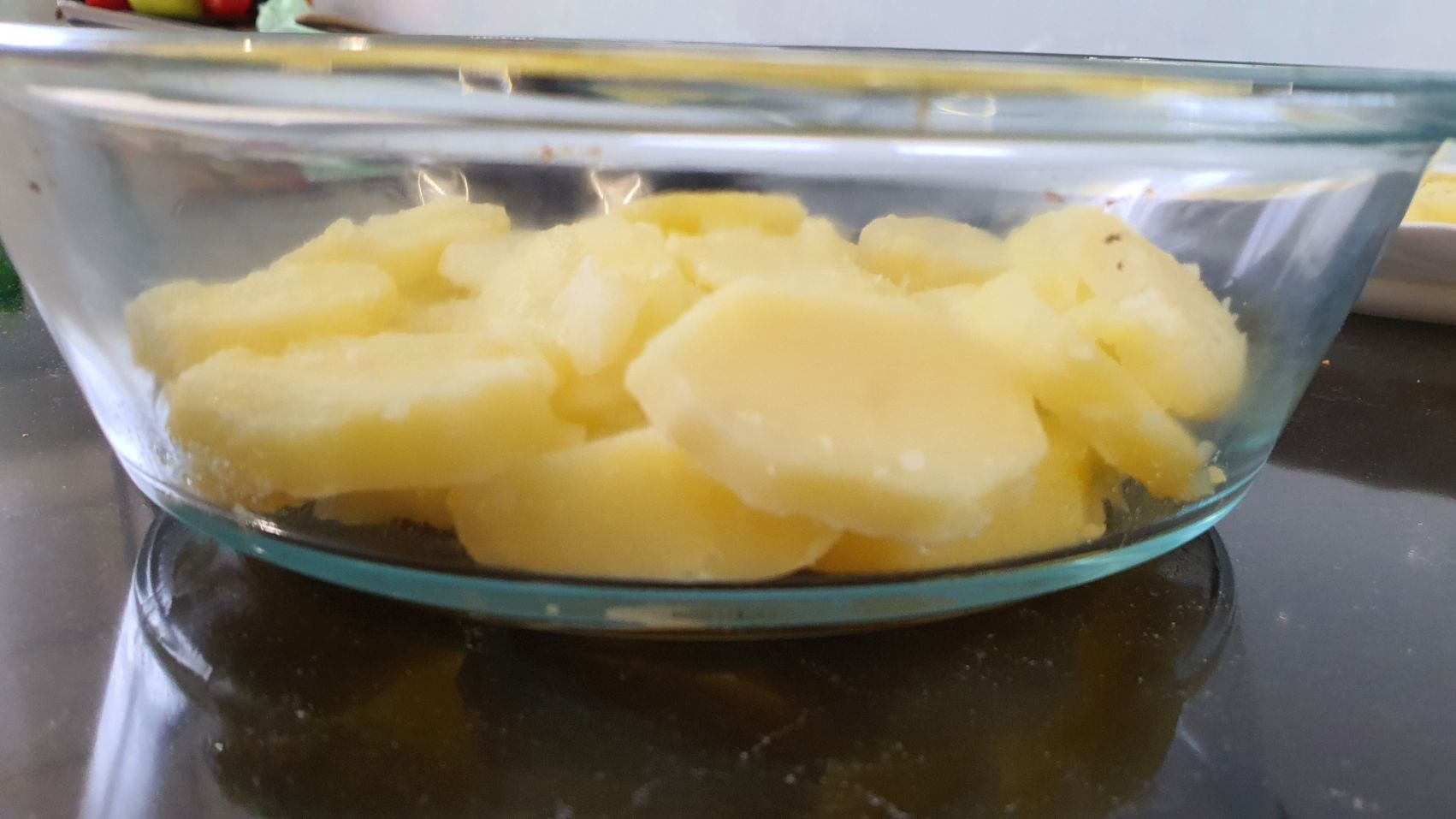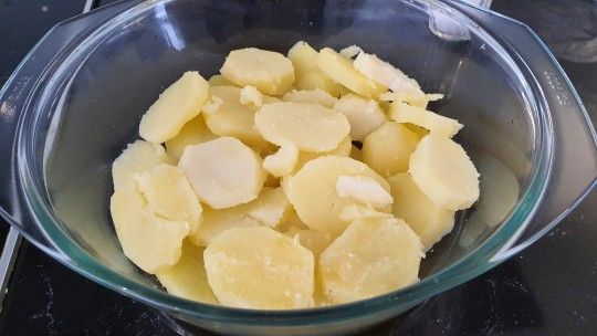 Ułożyć plasterki ziemniaków na dnie naczynia