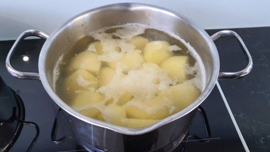 Gotować ziemniaki około 10 - 15 minut od zagotowania, aż będą trochę miękkie, ale nie za miękkie (sprawdzać widelcem)