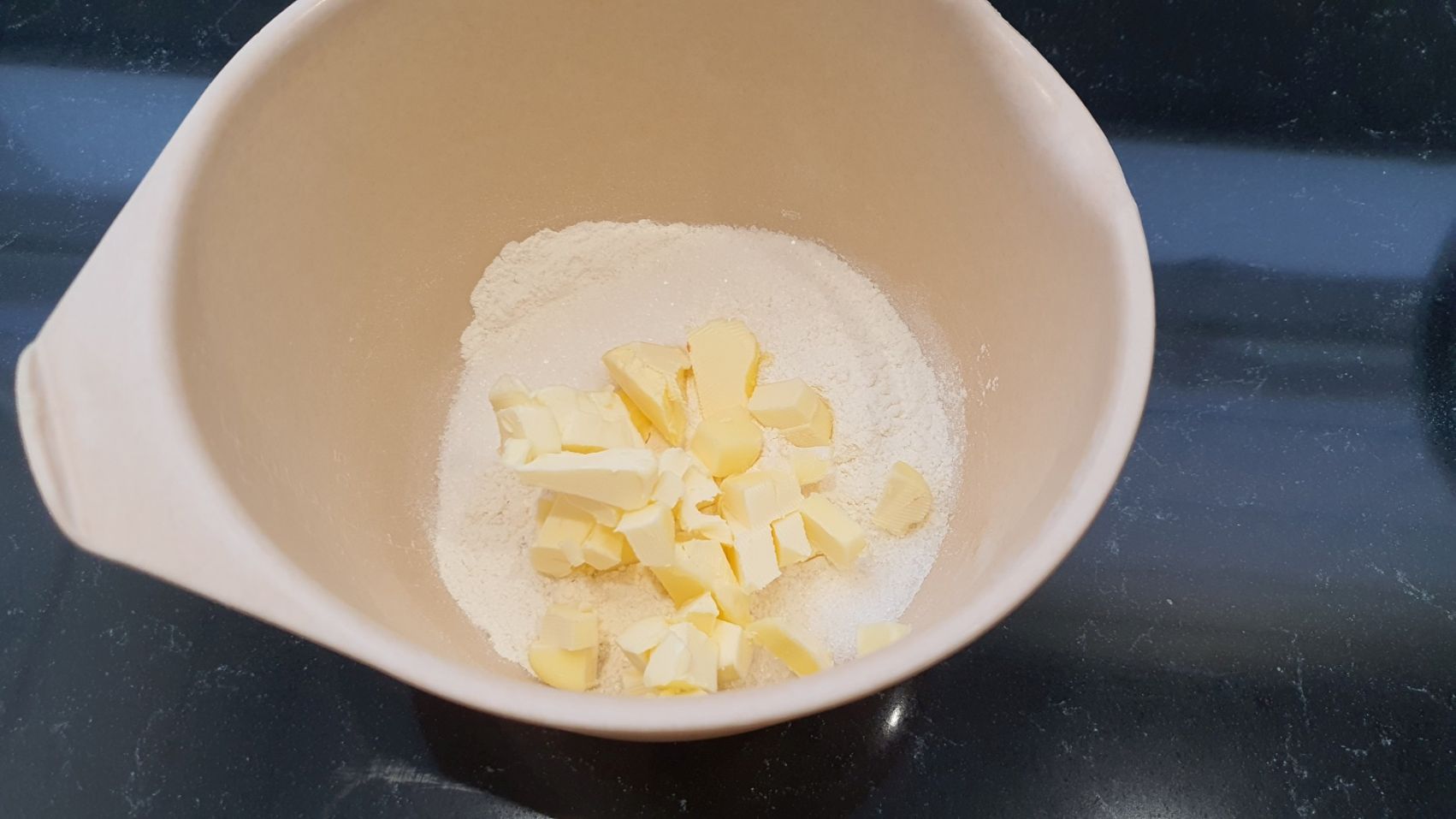 Do miski dodać mąkę, cukier i zimne masło pokrojone w kostkę